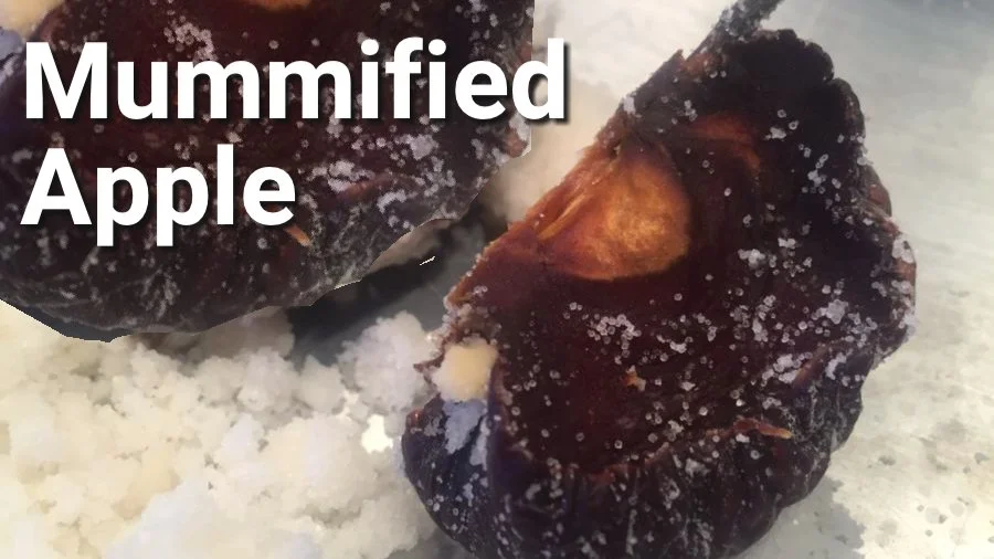 Mix 1 part salt with 1 part baking soda. Cut apple in half or quarters. Place apple in jar and fill with salt mixture. Wait 1-2 months, then extract the apple and observe!