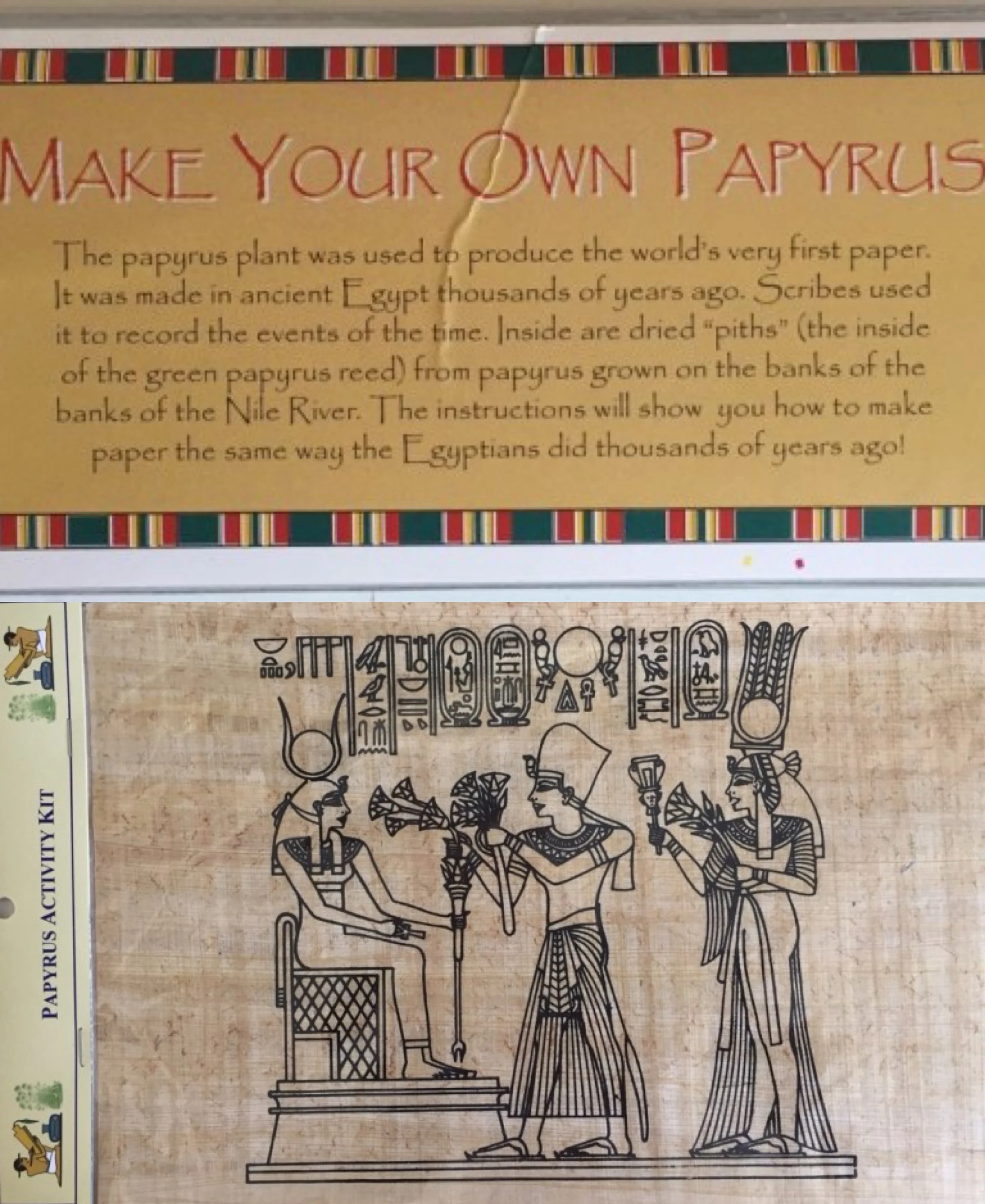Have you ever tried to make your own papyrus? We have, and it’s harder than you think! In fact, I’m thoroughly convinced that I would be fired from papyrus making if I lived in ancient Egypt! Aside from totally failing, it would have been good to check the directions completely before beginning this project, if for nothing else, to set an example for my onlooking children! That being said, I am thankful we had two different sets of kits, so when we failed with the first, we could fully fail with the second one!!We bought both kits from Rainbow Resource. The Papyrus Making Kit came with dried papyrus strips, while the Papyrus Activity Kit came with a large sheet of printed papyrus for painting and information about the papyrus and ancient Egypt in addition to directions.