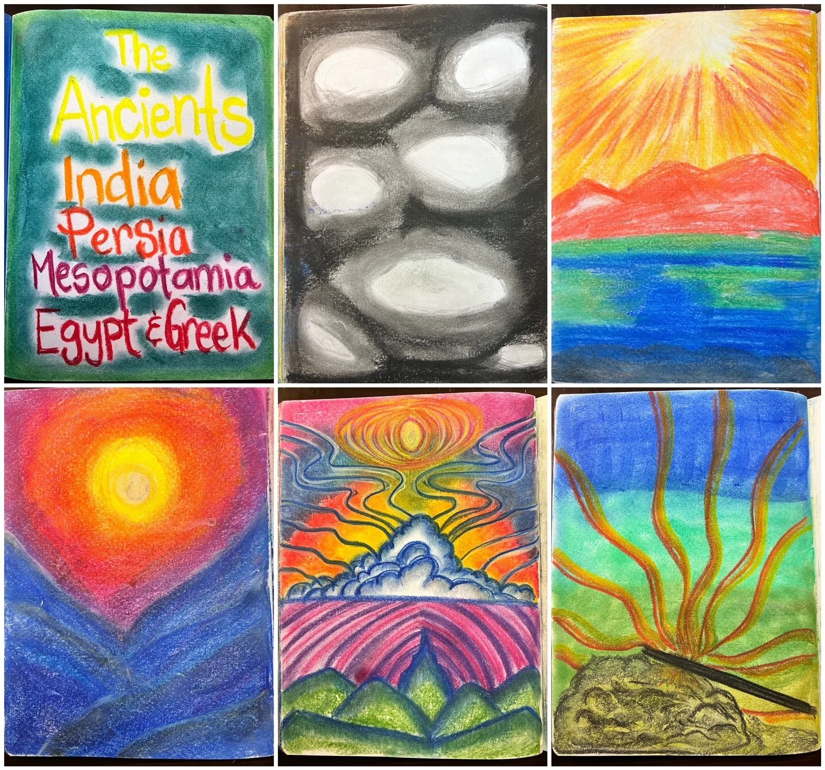 We continue our main lesson book entries using our Sargent Art chalk pastels. We use a matte fixative to seal the chalk and keep it from smearing. These are some of the entries we made for this main lesson block. If you’d like to see the process for Lesson 2: The Creation Story of the Ancient Persian, the coming together of light and dark and the middle world of land and see, click HERE. You may also follow on Instagram and TikTok for a daily look at how we homeschool.