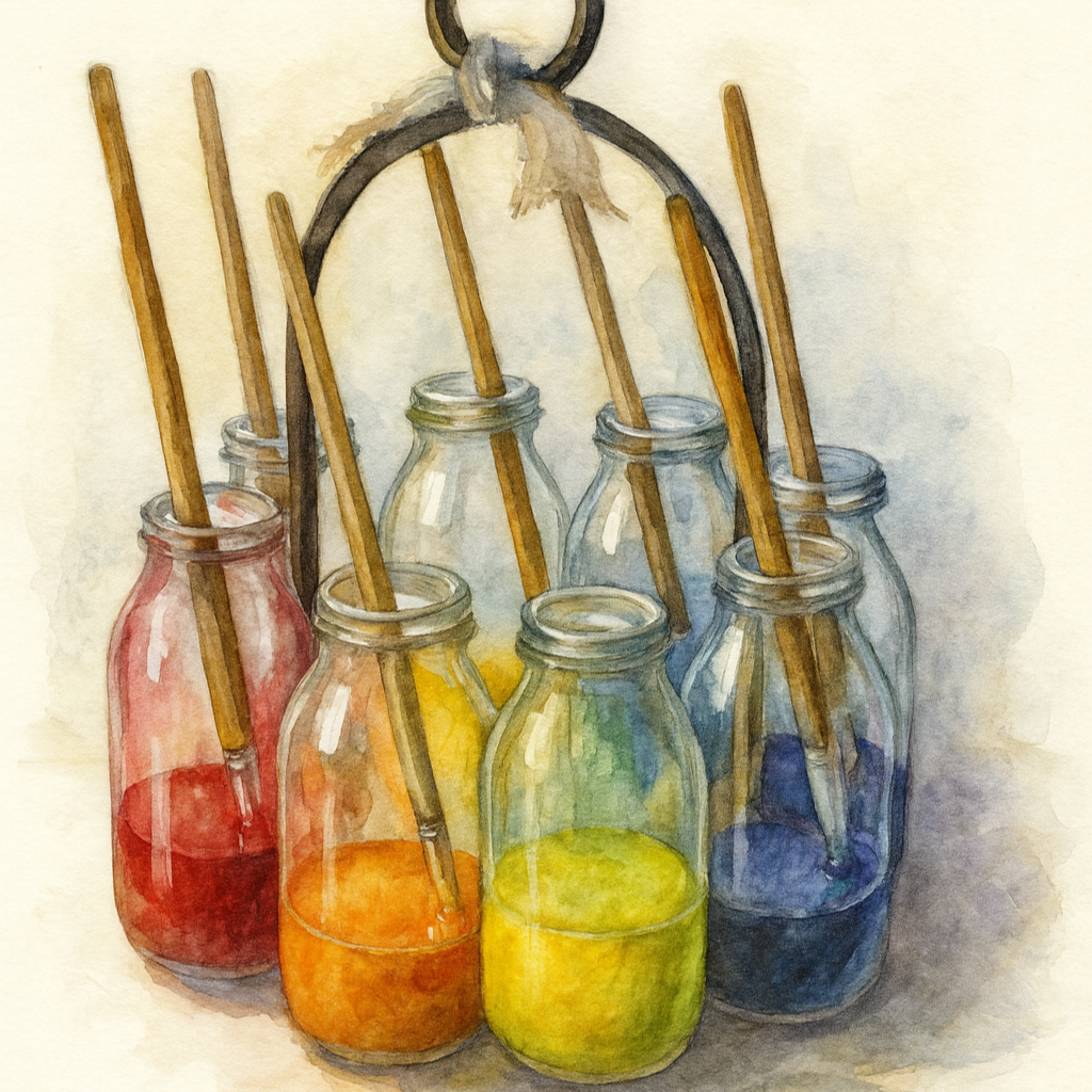 Lately, I've been using open glass jars for our paints and they've worked well for one surprising reason: The paint doesn't mold! Instead, the water simply evaporates and and leaves a dried cake of paint which can be rehydrated for later use. This has worked out well for this series of lessons because, while we are working through lessons almost daily, we are not using all the colors at the same time, so some of them dry out and all we need to do is add a bit of water and get painting!