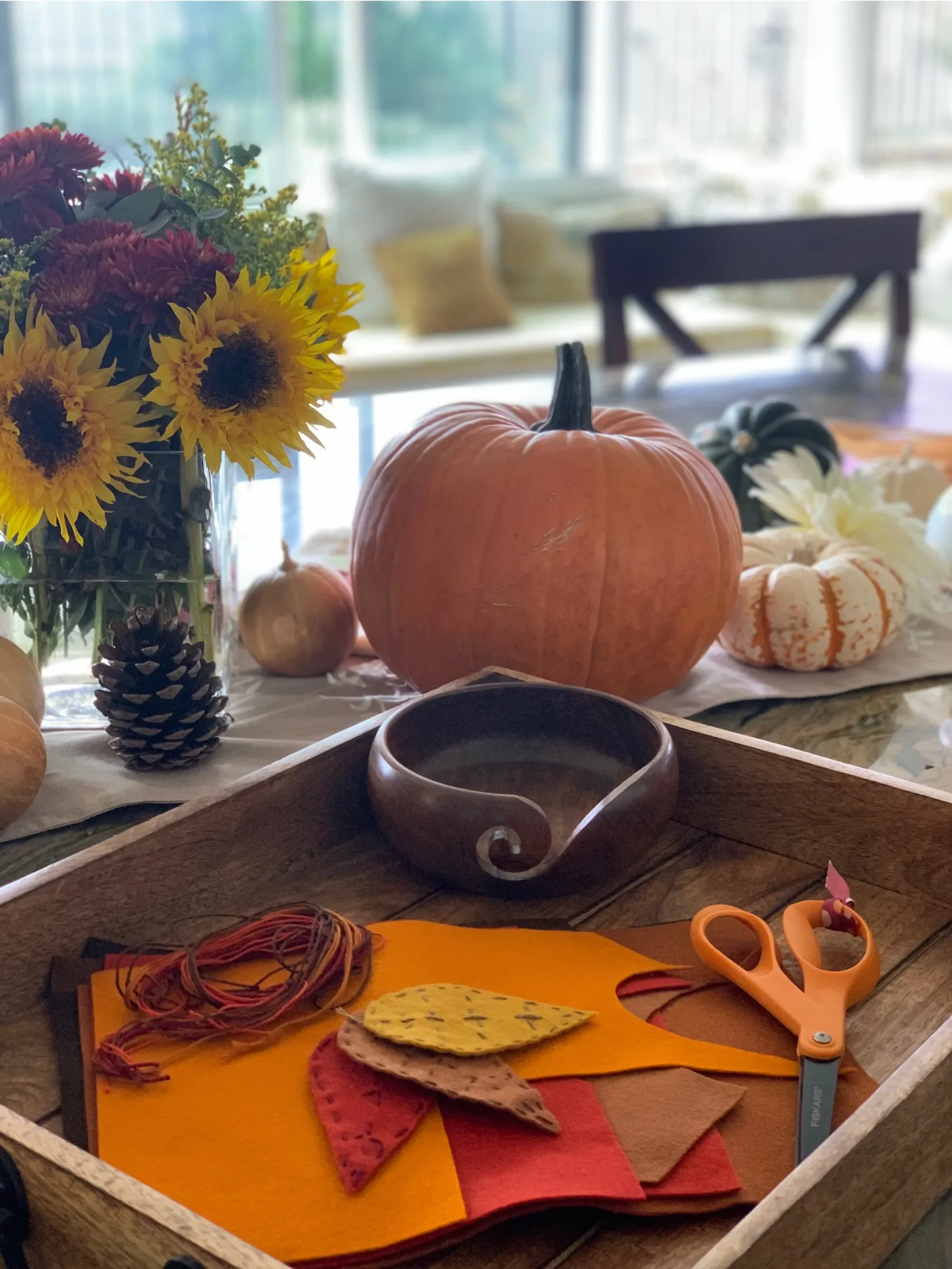 While I finished cooking, I got my daughter & my 7-year-old nephew started on an autumn craft: stitching a felt leaf. My son had cut the leaves out of wool felt & all the supplies were set. Both kids showed little interest and only stitched a few stitches before giving up. They both moped and left their project unfinished.