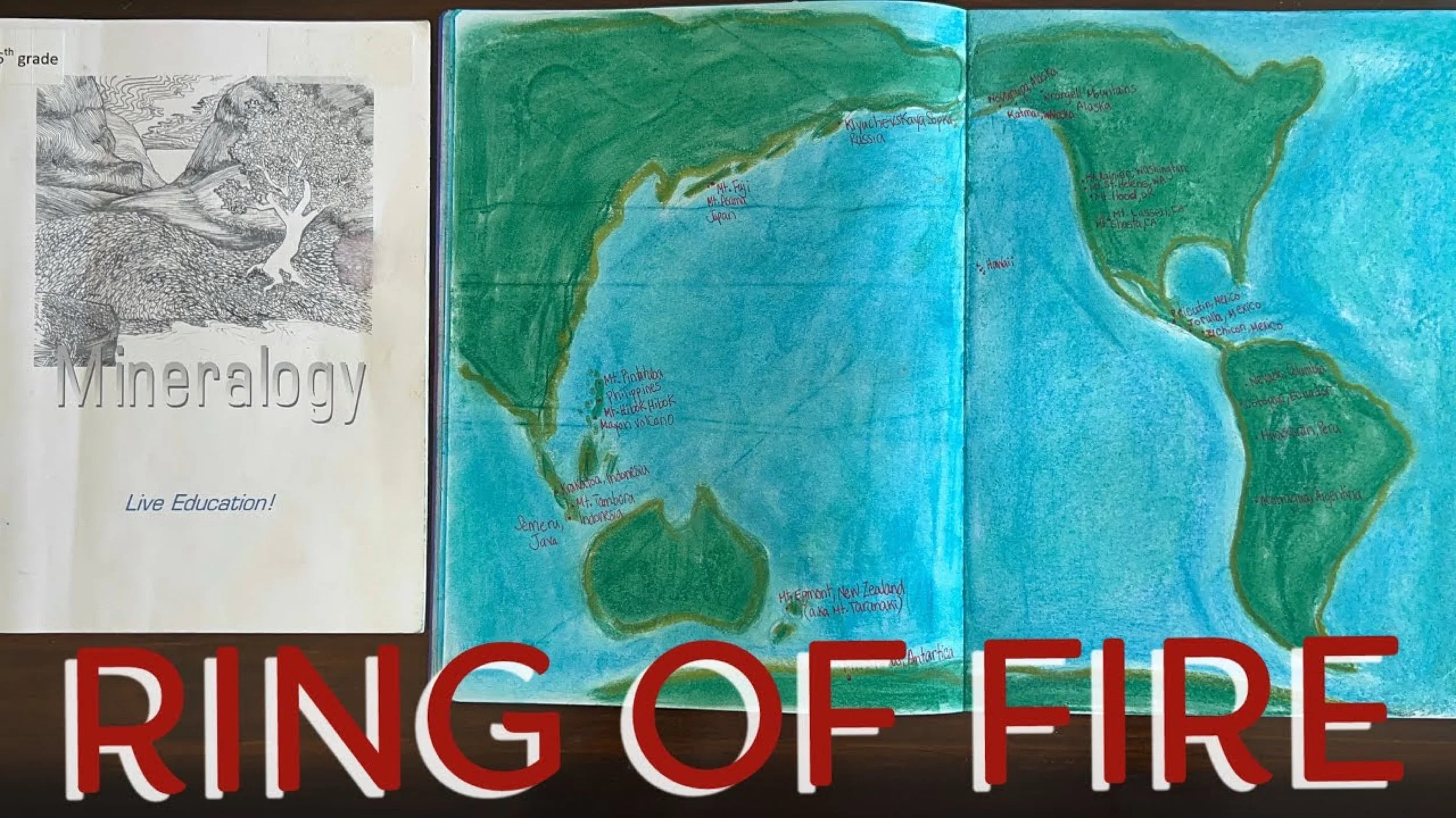 For our Waldorf mineralogy main lesson block, we continue with our lessons on land formation, plate tectonics and volcanic activity. Today's lesson is about the Ring of Fire. We used chalk to cover our double page layout in blue.