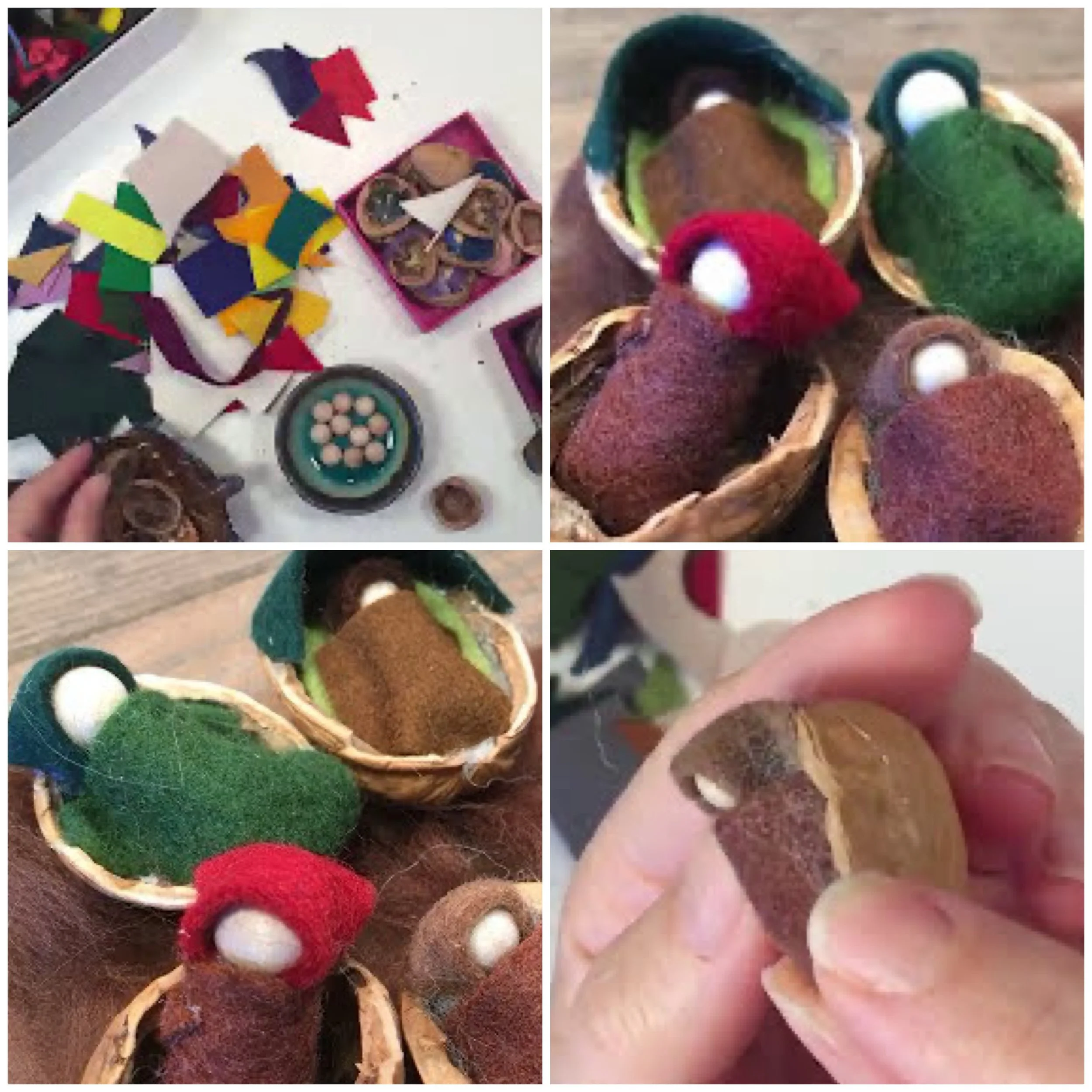 For such a tiny craft, you'd think they'd be easy to make, but working with such a tiny space was actually a bit challenging at times. First we cracked walnuts carefully so we could get full shell halves. This only happened half the time. I'm using a gorgeous nutcracker from A Child's Dream. Next we fill the walnut shell with wool top. For the babies, some were directly on the wool, others on blankets and still others were removable.