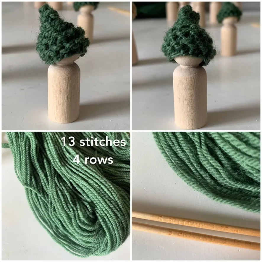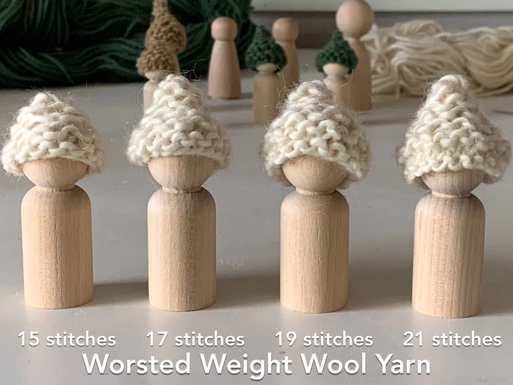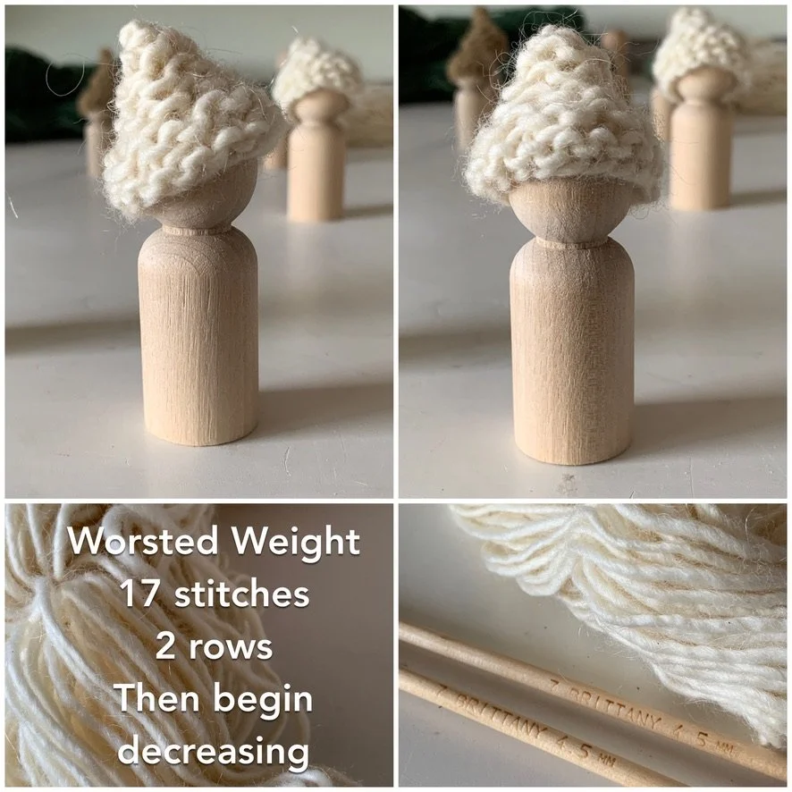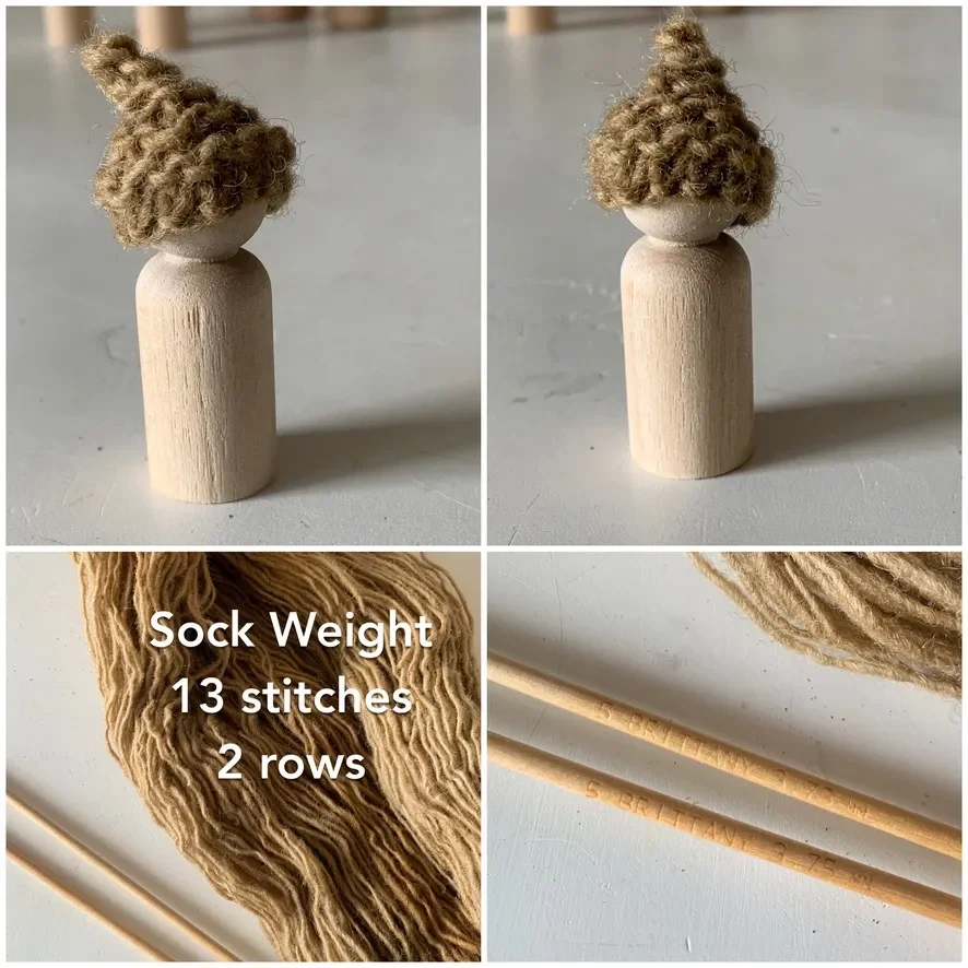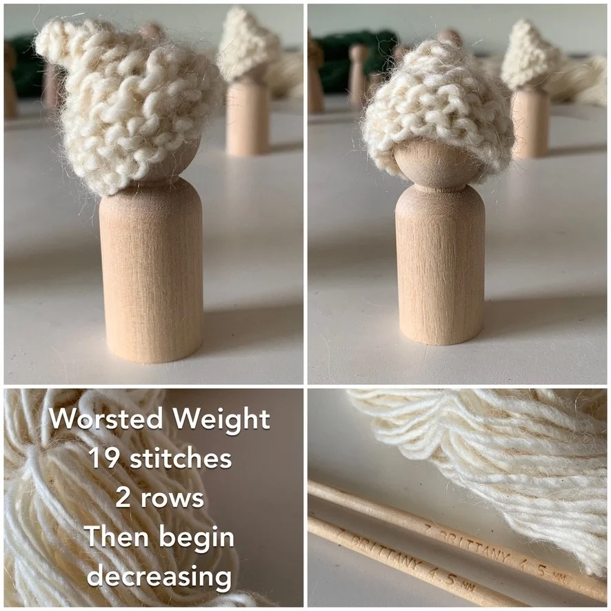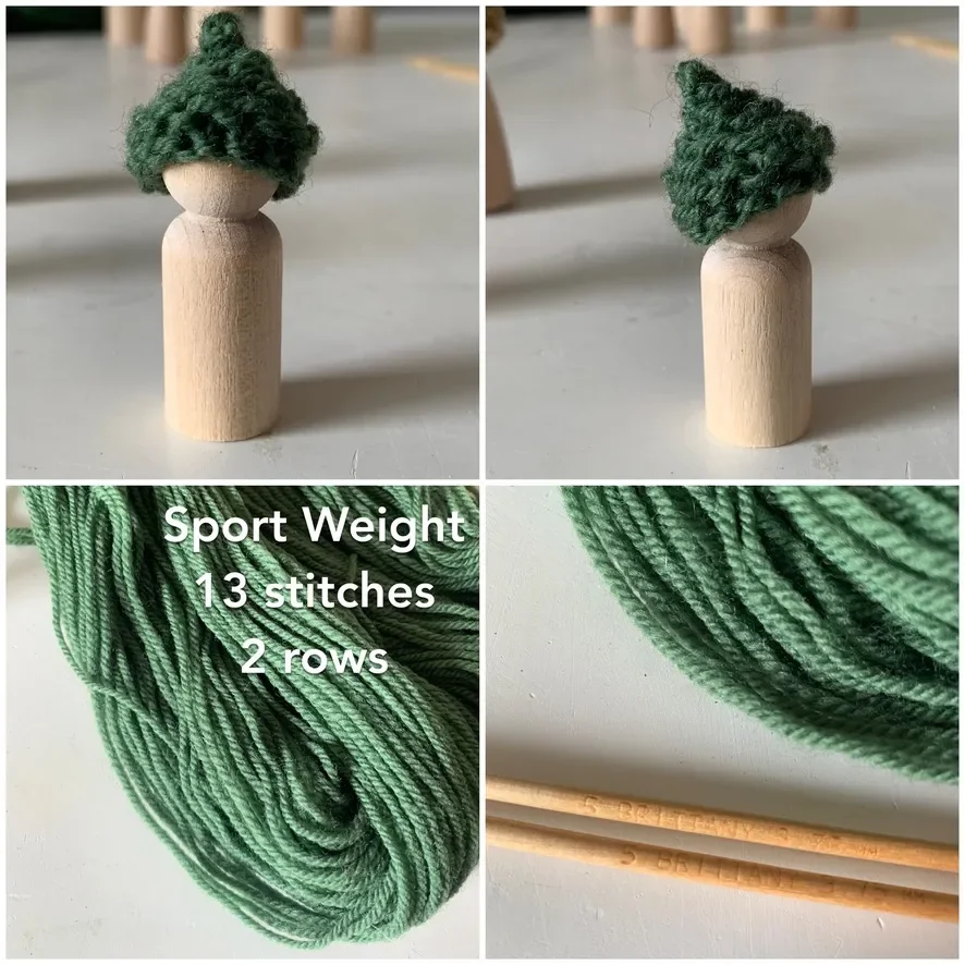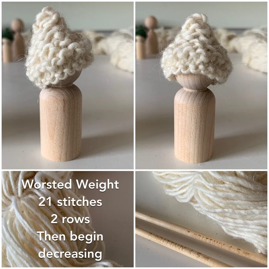 Once you learn the basic pattern for a hat, you can alter it to make it bigger, smaller or more pointy. For this project, I used sock, sport and worsted weight. I also altered a pattern I found in the book Making Peg Dolls by Margaret Bloom on the Martinmas peg doll tutorial.