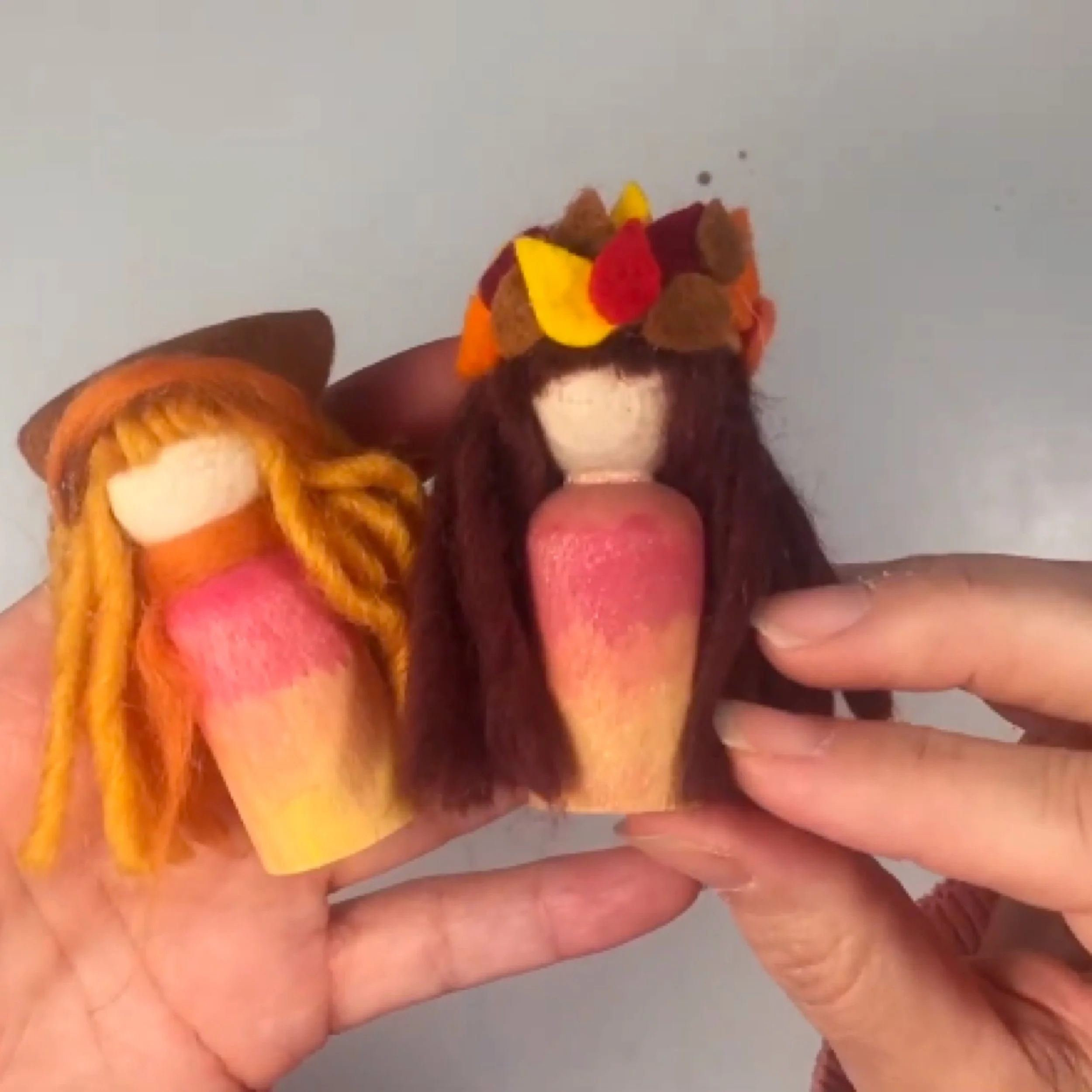 It's official, it's no longer pumpkin season, it's peg doll season! We've made more peg dolls in the past month than all the peg dolls we've ever made combined. We're on a roll. And now we are adding themed ones to our nature table and having a blast doing it. All the materials are from A Child's Dream. I used the large peg dolls, Lyra paint, Lamb's Pride wool yarn, and Holland Felt. The shimmer was not from A Child's Dream. It's called Perfect Pearls.