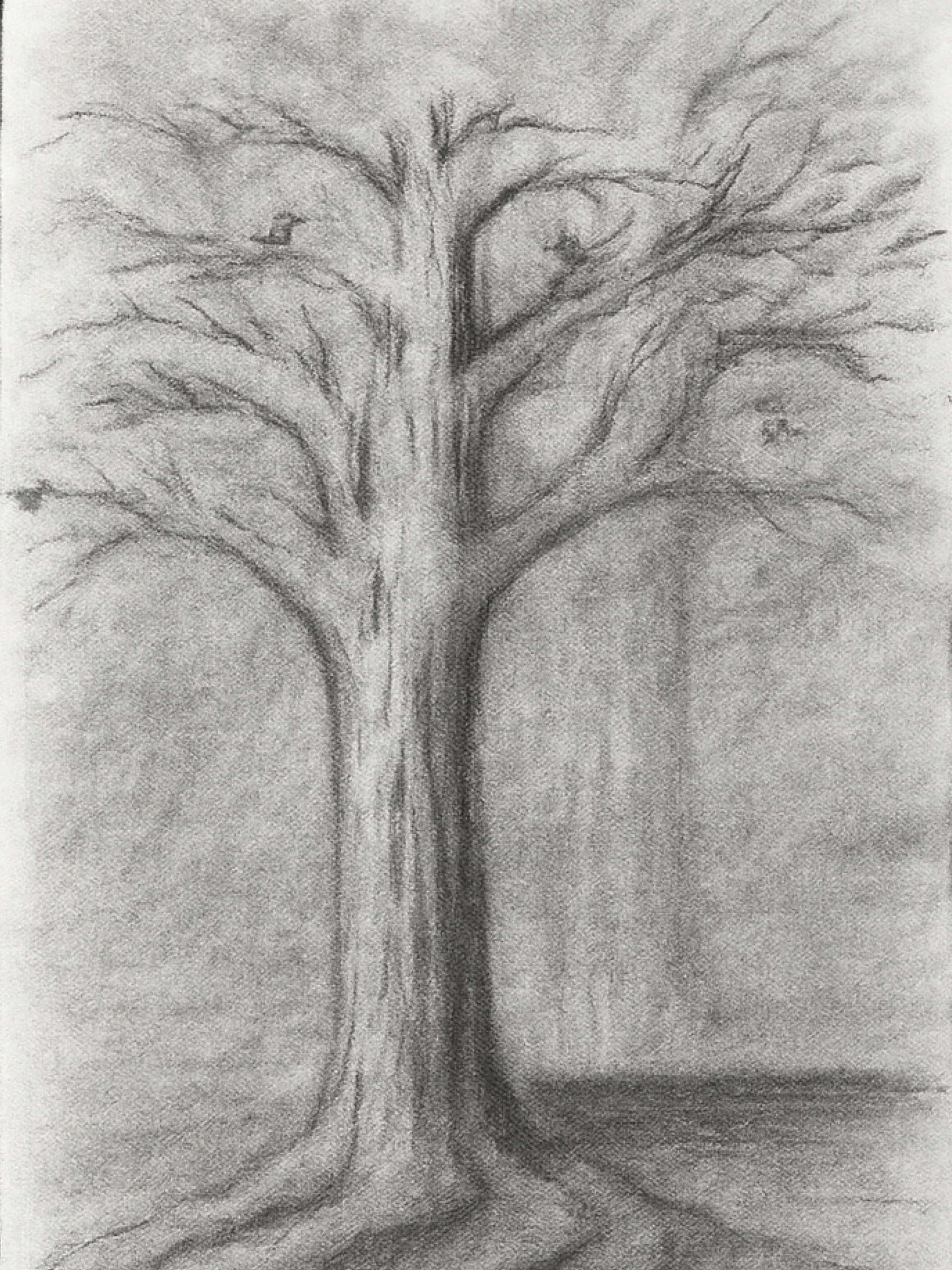 For this lesson on shadow, we used charcoal to draw trees on both the onion skin page separating the pages of our 9.5"x12.5" Main lesson book from A Child's Dream. We played with negative space and left the page mostly white which is a grand contrast from our other illustrations.