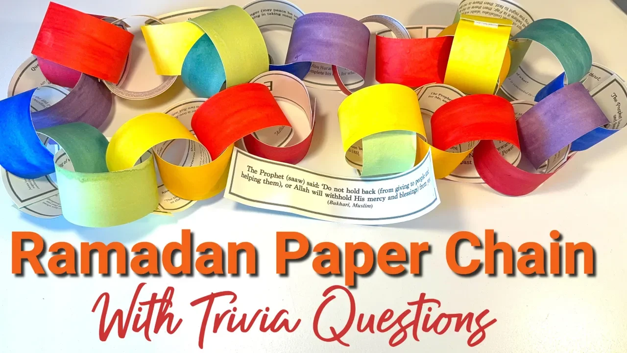 Paper chains are easy to make and festive. I have my own take on this classic design. I've included questions, information and hadith on the inside chains. Now, you can remove a chain each night of Ramadan and read the inside. The paper chains are numbered so that information pertaining to the first ten days of Ramadan is included in the first chains to be opened. It's a countdown paper chain, so you'll begin by opening chain '30'.