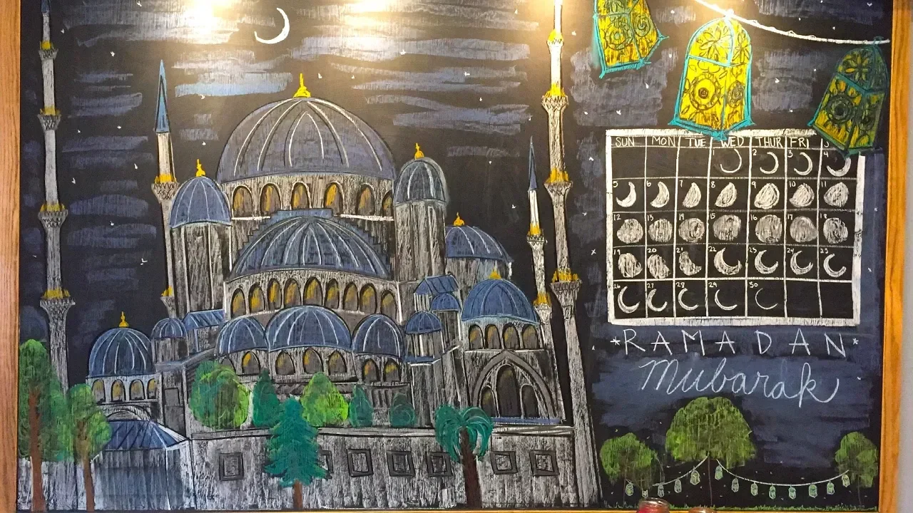 This chalk drawing for Ramadan 2025 turned out cozy and inspiring, but not quite what I was hoping for. I'm working on a 4'x6' slate chalkboard that I painted with chalkboard paint several years after I got it. It helped for a while, but it is in need of some care before I'm having a hard time getting the chalk to adhere well to the chalkboard.