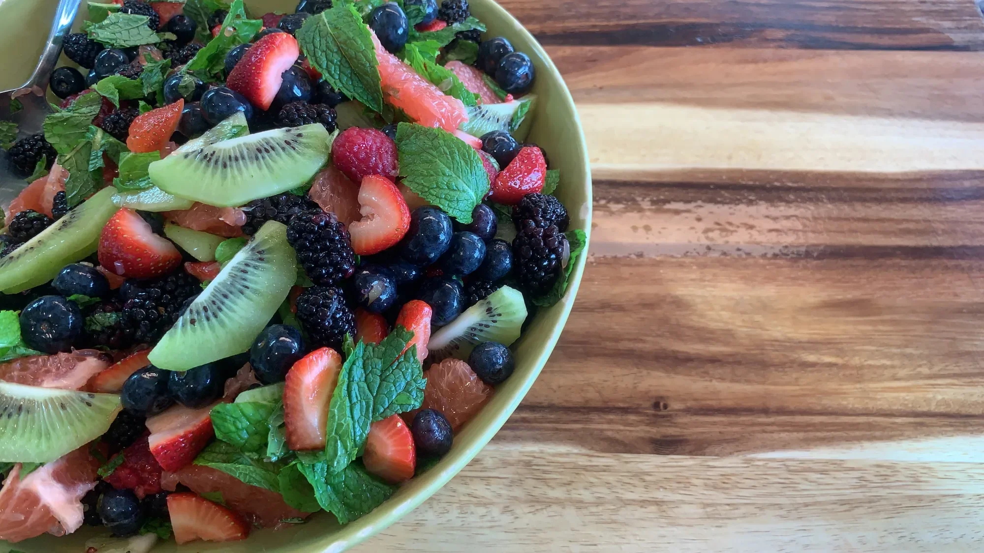 What's great about a berry salad is that you can skip cutting, slicing and dicing! I juiced four limes and one lemon for the dressing, then added 2 kiwis, 1 pound of strawberries cut into quarters, 6 ounces of raspberries, 18 ounces of blackberries, 18 ounces of blueberries, and 2 grapefruits. I added a handful of chopped mint then tossed everything and served it immediately. You don't want to let this fruit salad sit.