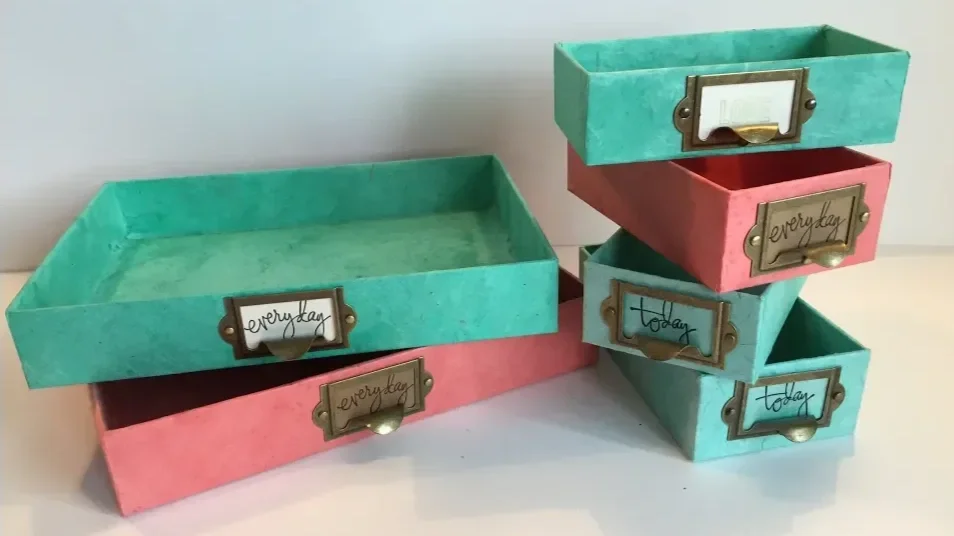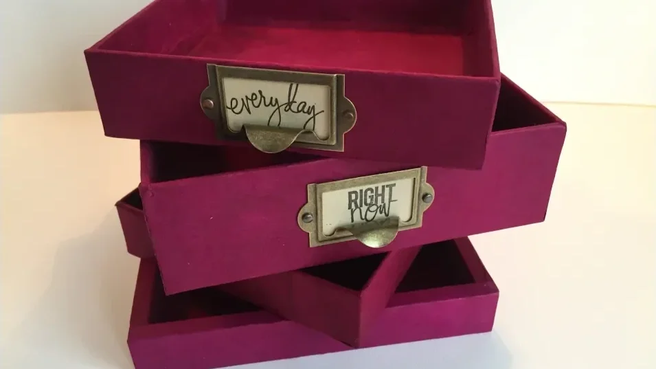To complete the project, I added a metal label pull to the front using brads and the paper piercer to secure them. I finished with a simple kraft paper label stamped with black ink that read “Today.” The result was a refined, functional storage box that looks elegant on any shelf. This upcycled box took only a few minutes to make and turned out beautifully. For more box-covering and paper craft tutorials,