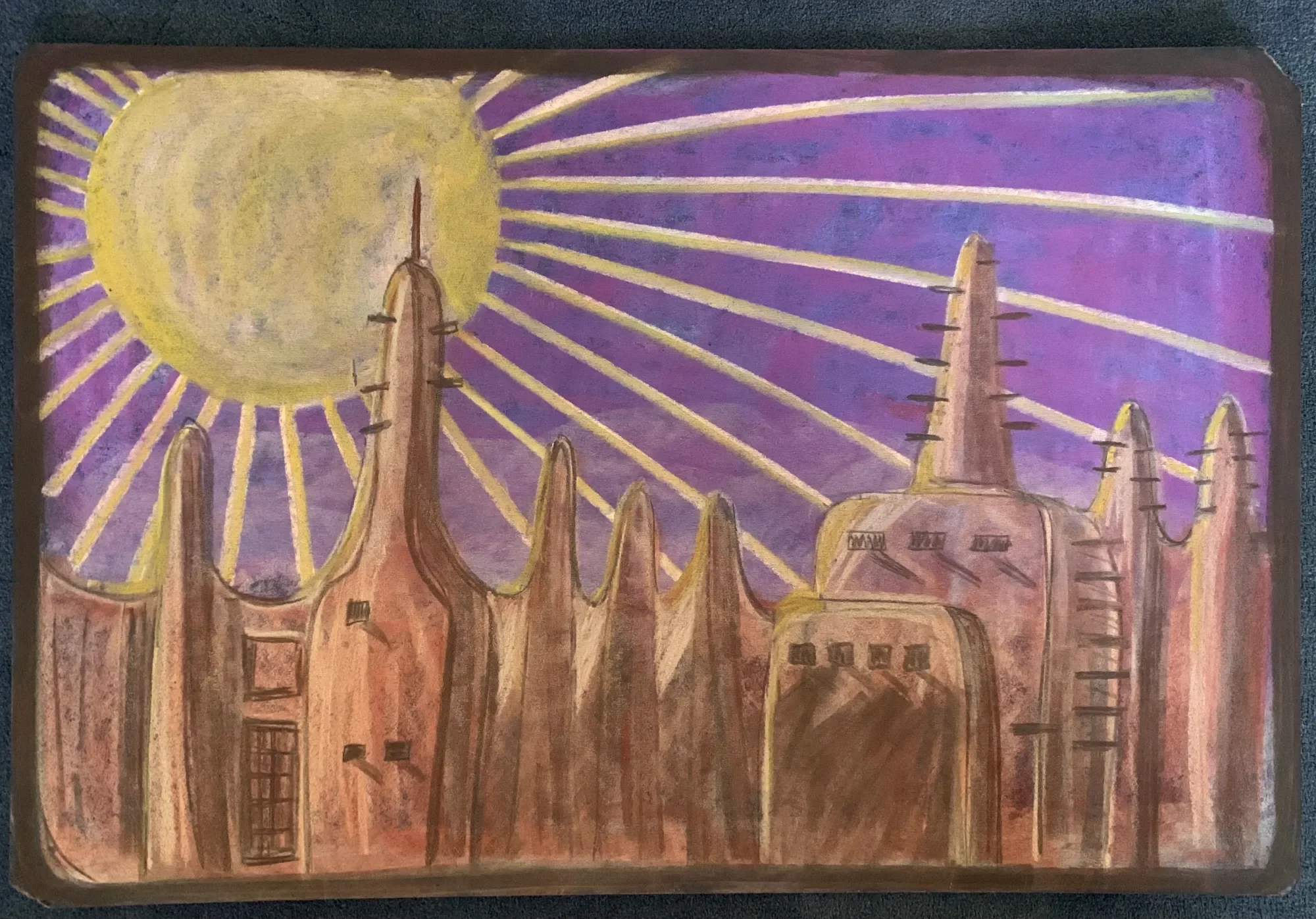 I'm using the book Mansa Musa by Khephra Burns and illustrated by Leo and Diane Dillon as inspiration for today's chalk drawing. At first I contemplated doing a historical map of Africa with physical markers and coloring, but then I thought it was not inspiring and too hard. Map drawing takes skill and perseverance, and this day, I had neither. So I settled on what I thought would be the easiest drawing for this unit: Sandstone structure, likely a masjid, with a brilliant oversized sun and warm lavender sky. Boy was I wrong about how easy this would be. It wasn't. While I love the way it turned out and honestly can't stop gazing at it, it was not easy or quick by any means. This drawing took nearly 30 minutes to complete and for such a small chalkboard, I feel like that's a lot of time, but then again, maybe it isn't. The challenge was entirely in getting the shading right and the shapes correct. The shapes were okay, though for simple soft edged triangular pillars, I did struggle to get the curves just right. What I loved was the layering. I was so pleased that this drawing only utilized about 6 colors: two for the sky, two for the sun, and two for the structures with the addition of the two sun colors for the highlights on the structures. I worked for the edges in and from the background to the foreground. I started with the border which I often don't do on the large chalkboard since it is framed. I love the look of a border as long as there is room, otherwise it looks cramped. Next I did the sky. I didn't have lavender or purple because I recently used up all the pinks and purples from all my old sets of chalk to make some super large six-fold symmetry art on our driveway and I figured those colors rarely get used as my earth tones for quickly. So for the sky, I layered pink then blue, oh and one more dark pink/rose hue, so I suppose that means three colors for the sky. Then I drew the sun in a peachy pale neutral before layering yellow towards the end. I took that peachy neutral and covered the bottom of the chalkboard before drawing in the structure in a warm medium brown. Lastly came the shading. I took a dark neutral brown and shaded as best as I could finishing with a light pale neutral for the highlights. Then I decided to give the edges of the structure a bit of yellow to really make it look as if the sandstone masjid was basking in the sun. I love the warmth this drawing exudes and feel as if it really captures the essence of what I imagine this time period and location were like.