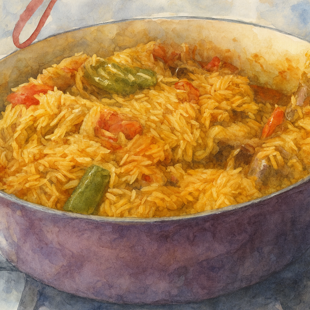 Few family recipes are all around crowd pleasers. There’s usually at least one person who doesn’t like something I cook. Usually that person is me. And yes, I’m not a fan of this dish…well at first that is. I’m not a rice fan (except for Zeresh and Adas Polo and a new pomegranate rice), so biryani and kibsas don’t interest me. This dish is similar to a biryani or kibsa in the sense that it’s a one pot meal in which the rice will cook with the rest of the vegetables and meat. It’s so easy to make, but it does take over an hour to cook. It takes about 15 minutes to brown the onions and add the tomatoes, spices and other ingredients (that also includes prep time as I chop and prep while the onions are cooking), then 30 minutes to cook the chicken, and another 30 minutes to cook the rice with the chicken. But once it’s done (and if you cook it in a pot big enough), you’ve got food for a dozen servings! This recipe was adapted from the book called Nigeria by Patricia Levy. While we did take some liberties with this recipe, I do believe in capturing the essence and spirit of a historic or regional meal. As these are part of our homeschool lessons, the experience is the primary goal, accuracy is secondary and trying new ingredients is somewhere in there! Actually, I love the idea of trying new foods, but sometimes the pain of finding them often means we are using alternatives which are part of our daily diet and that seems to defeat the purpose. For this meal, I used 6 drumsticks and 4 leg quarters. I seasoned with cumin, curry powder, salt, and onion and garlic powder. I used about 7 cups of water and 4 cups of rice. I added 3 large tomatoes (but I would have preferred more), plus two jalapenos which were medium spicy. I think it would have been tastier if I used chicken or vegetable broth, but I didn’t have any. I also used parboiled basmati rice which I find holds up really well to these kinds of dishes where the rice is soaking with the meat or vegetables. I also used my cast iron large oval pot from Le Creuset which helps ensure even temperatures.